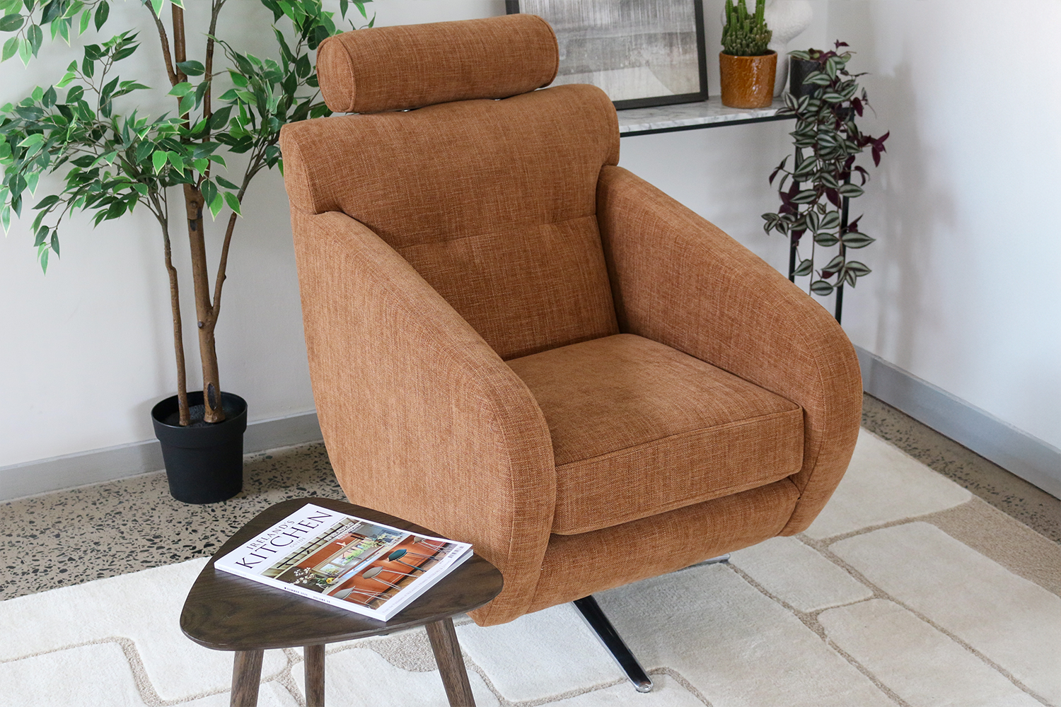 Add a bold statement to your space with this contemporary swivel chair, designed for both eye-catching style and supportive comfort. The sleek silhouette features gently curved arms and a high, cushioned back, offering a striking profile that doesn’t compromise on relaxation. A streamlined headrest provides added neck support, making it ideal for extended lounging or reading sessions. Set atop a durable metal base, the 360-degree swivel function brings dynamic movement to your seating arrangement—perfect for modern living rooms, home offices, or reading nooks. The generously padded seat ensures superior comfort, while the tailored design adds a refined, modern flair. This chair is more than just a functional piece—it’s a statement of innovative design and everyday luxury. Whether used as an accent chair or part of a coordinated interior, it promises to deliver comfort, versatility, and standout style. A perfect addition for those who appreciate modern design and ergonomic seating.
